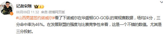 山西男篮另外一名外援为早早确定的诺威尔。他在华盛顿GO-GO队的常规赛数据,场均24分,三分命中率为46%。在发展联盟的强度与比赛竞争性来看,这是一个不错的数值。