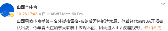 此外“山西全体育”的报道,山西男篮本赛季第三名外援格雷格•布朗后天将抵达太原。他曾经代表NBA开拓者队出战,今年夏天在加拿大联赛中表现不俗,因而进入山西男篮视野。